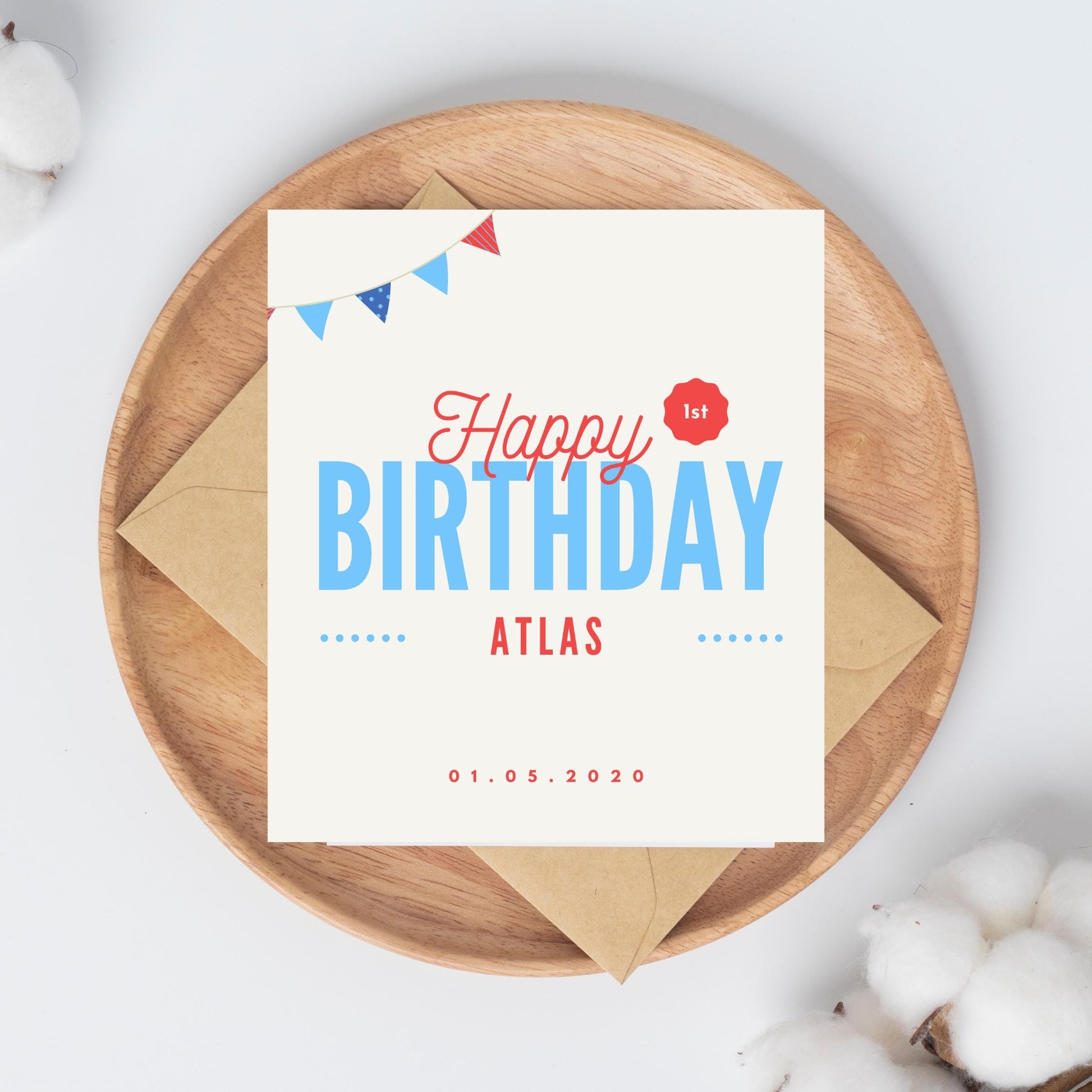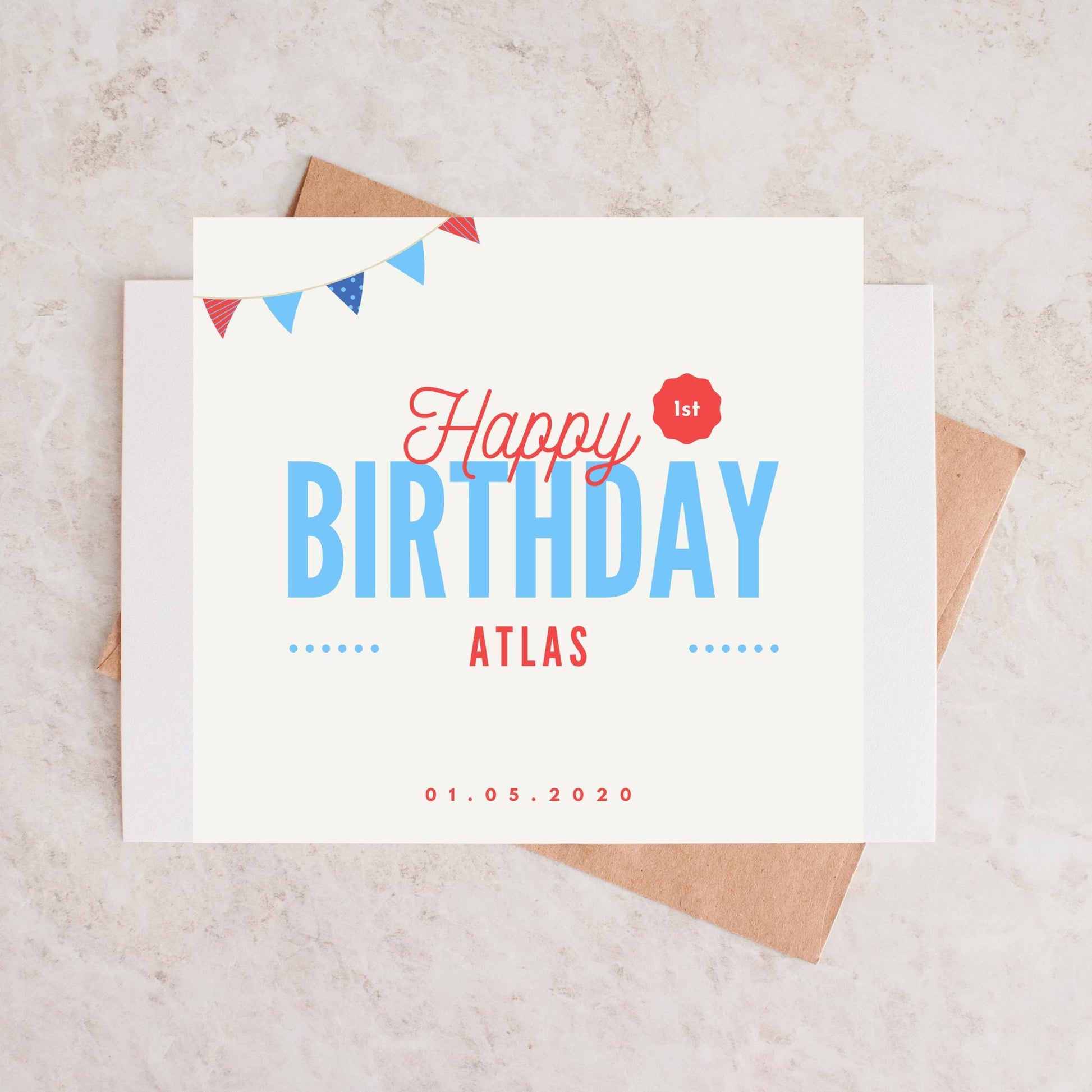 Celebrate your little one's special milestone with this adorable Personalised Name and Date card, perfect for boys or girls turning one! Featuring a charming bunting party design, this custom birthday card can be personalized with their name and the memorable date, making it a heartfelt keepsake for family and friends. Whether you're a parent, grandparent, godparent, or friend, this beautifully crafted card adds a personal touch to their first birthday festivities.
